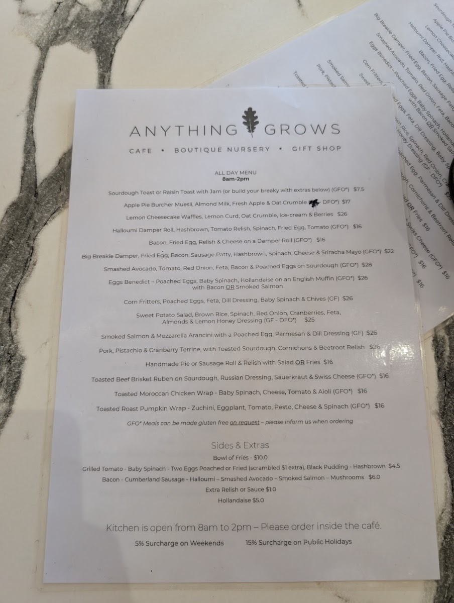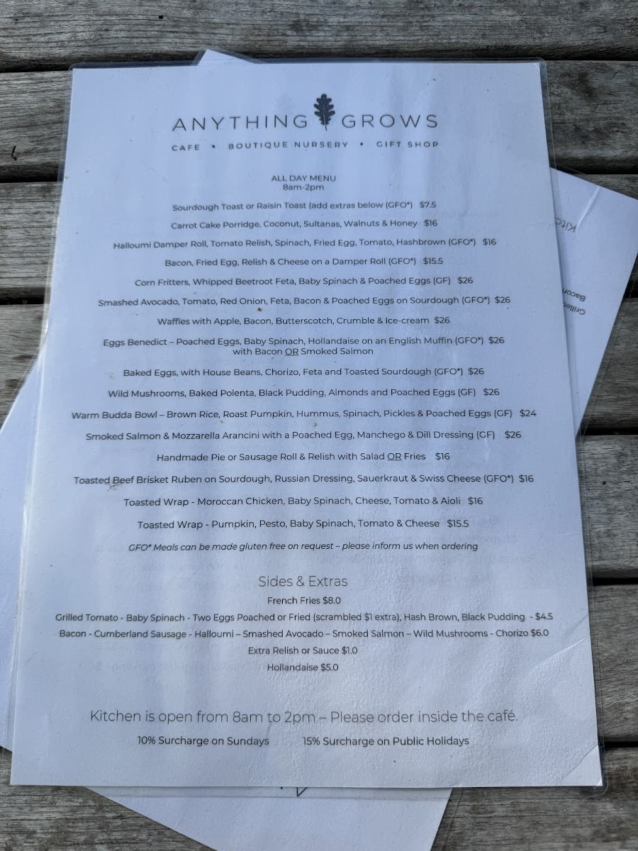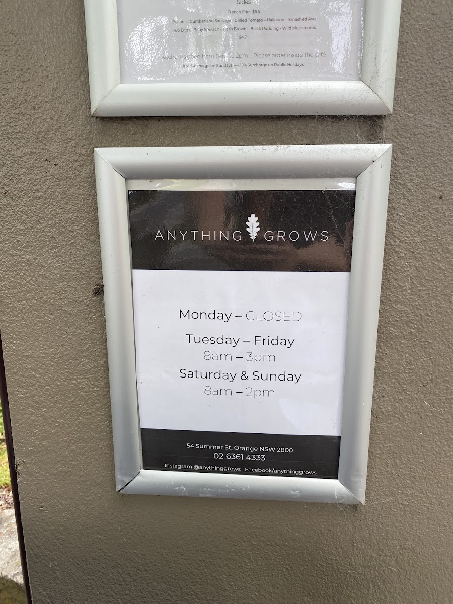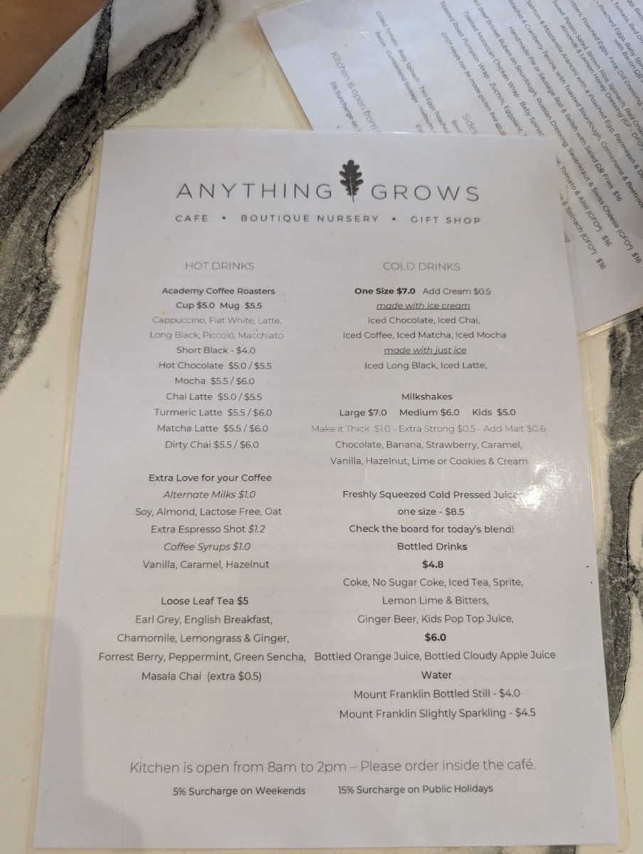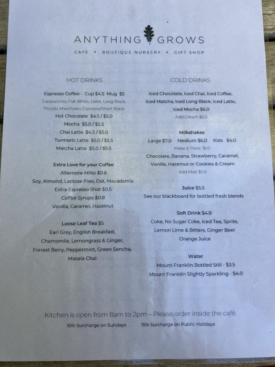 The menu at Anything Grows offers a delightful mix of hearty and refreshing options. For breakfast or a light meal, you can enjoy a classic Sourdough or Raisin Toast or opt for a filling Bacon & Egg Damper Roll or Halloumi Damper Roll. For those seeking something a bit more wholesome, the Coconut Porridge and Smashed Avocado are popular choices. If you're after some extra sides, the menu includes a Bowl of Fries, Grilled Tomato, Baby Spinach, or Two Eggs (either poached or fried, with scrambled eggs available for an extra $1). You can also indulge in Black Pudding for a savory twist. The drink selection caters to all tastes, featuring hot beverages like Cappuccino, Flat White, Latte, Mocha, and Long Black. For a refreshing treat, cold drinks like Iced Drinks with Ice Cream or Iced Drinks without Ice Cream provide a perfect pick-me-up, alongside indulgent Milkshakes and Freshly Squeezed Cold Pressed Juices. The menu beautifully balances indulgence and freshness, making it a great option for a variety of cravings throughout the day.